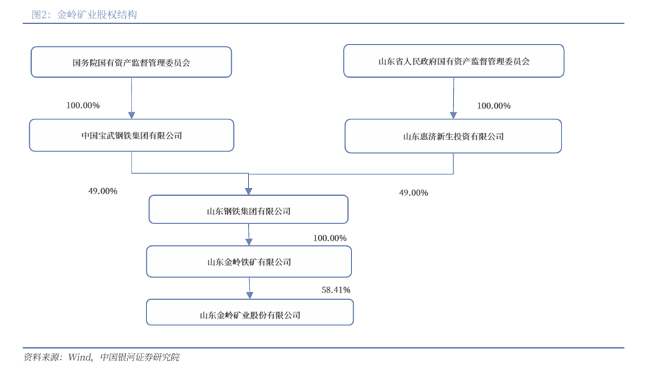 公司股权结构稳定,实际控制人为山东国资委。山东金岭矿业股份有限公司原名山东淄博华光陶瓷股份有限公司,1996年11月8日经中国证监会批复为社会募集的上市股份公司,股本总额51,740,000股,并于1996年11月28日在深交所挂牌交易(股票代码000655.SZ)。2006年6月,公司股权分置改革与重大资产重组相结合,山东金岭铁矿(始建于1948年)通过资产置换的方式以其合法拥有的侯家庄、铁山辛庄铁矿、选矿厂等铁矿石采选业务经营性资产及少量辅助性资产注入到公司,2006年10月完成了向金岭铁矿的非公开发行,公司名称变更为山东金岭矿业股份有限公司,成为中国第一家铁矿石资源类上市公司。2009年,金岭矿业收购塔什库尔干县金钢矿业有限责任公司100%股权。2012年,金岭矿业收购山东金鼎矿业有限责任公司40%的股权。2023年8月,金岭铁矿将其所持有的金岭矿业总股本数58.41%的股份所对应的股东权利全权委托山钢集团行使,山钢集团成为金岭矿业控股股东。