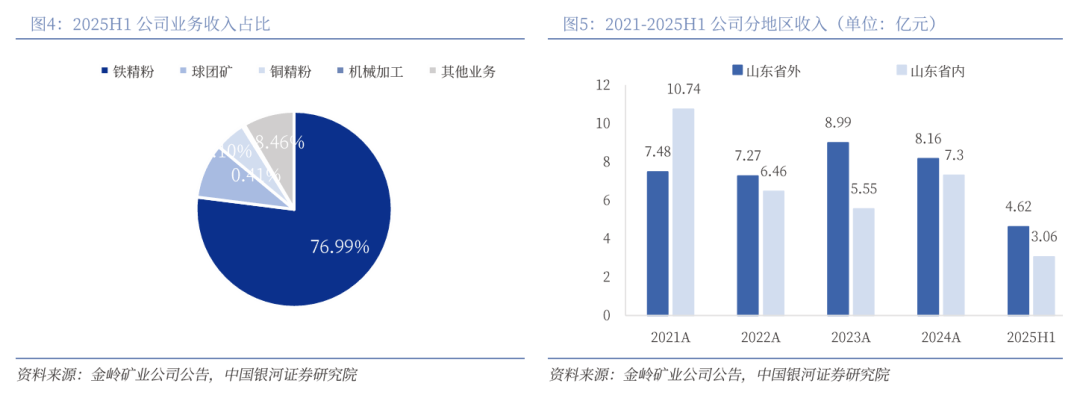 铁精粉产品质量卓越,未来勘探开采潜力较大。核心产品质量卓越:金岭矿业核心产品铁精粉凭借其卓越品质获得国家同类产品唯一“金质奖章”,铁精粉品位高,有害元素含量低,产品质量稳定,市场竞争力强劲,产品销路畅通。2025上半年公司铁精粉、球团矿、铜精粉、机械加工和其他业务营收占比分别为76.99%、9.03%、5.10%、0.41%、8.46%。其中,铁精粉毛利率25.39%,同比增加8.16个百分点;铜精粉毛利率83.67%,同比增加13.09个百分点。勘探开采潜力较大:2024年10月12日,公司成功竞拍获得山东省齐河县大张地区铁矿普查探矿权。该铁矿普查探矿权位于齐河—禹城富铁矿重点勘查区。此次探矿权面积21.3平方公里,勘查程度为普查,成矿地质条件为中等类型,有助于提升公司铁矿资源储备。