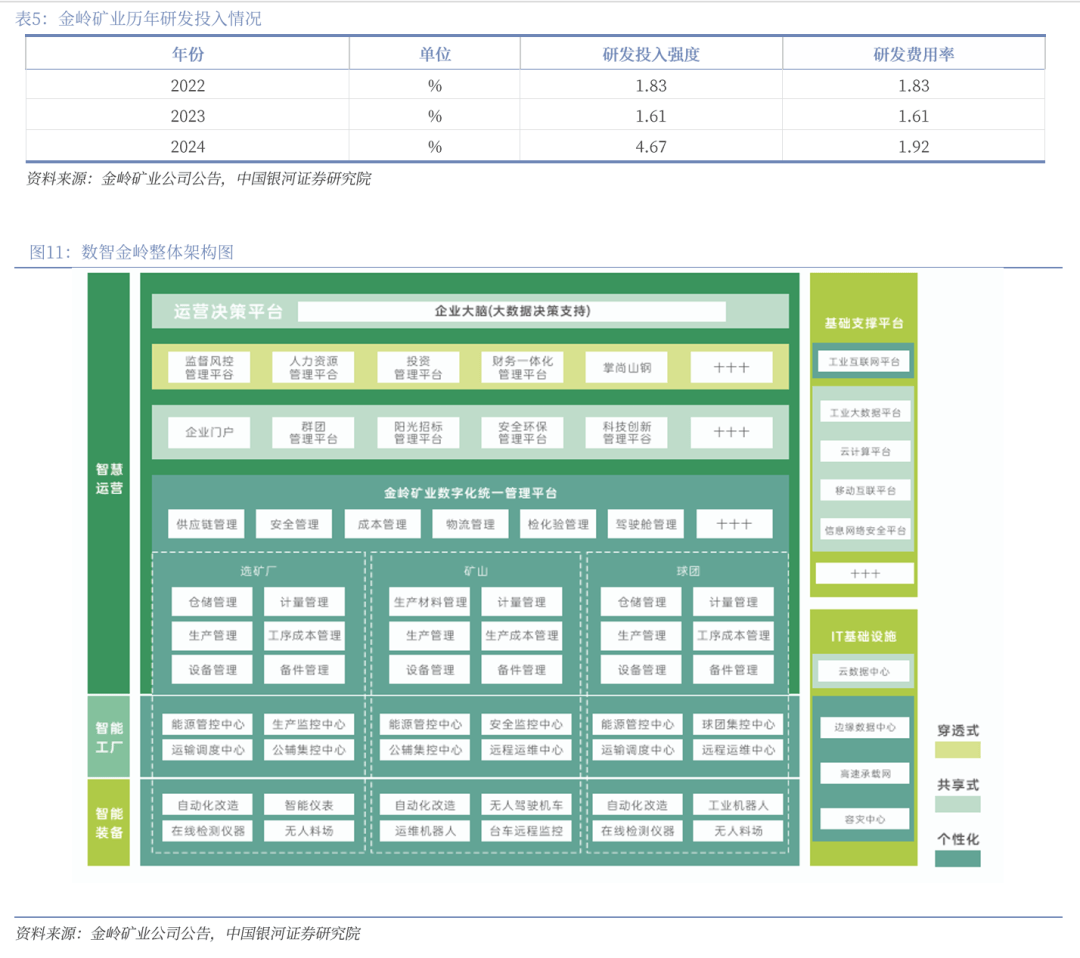 “数智金岭”建设提速,提升绿色发展效能。公司持续推动“数智金岭”建设,数智金岭一期一步项目整体建设完成,物流平台、检化验系统、生产系统及远程无人计量系统均已上线运行;智慧运营管控中心建设完成,管理驾驶舱界面开发圆满结束;成功利用人工智能大模型,开发出配矿模型。2024年,公司研发投入共计7,218.51万元,占营业收入的4.67%。公司现有专业技术人员316人,其中176人直接从事研究与试验工作,高级职称81人,研发团队总人数273人,占员工总数14%。
