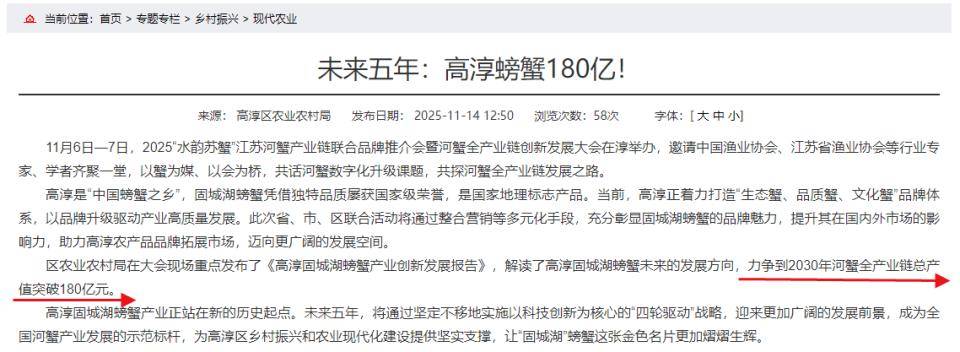 高淳区还提出了远期目标,力争到2030年河蟹全产业链总产值突破180亿元。