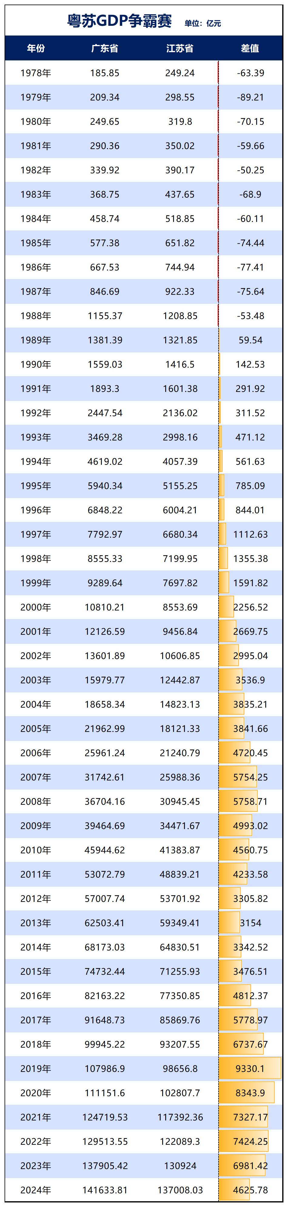 从2020年开始,江苏不断逼近广东,去年两者之间的差距缩小至4625.78亿元,相比于2019年的差距跌了二分之一左右。