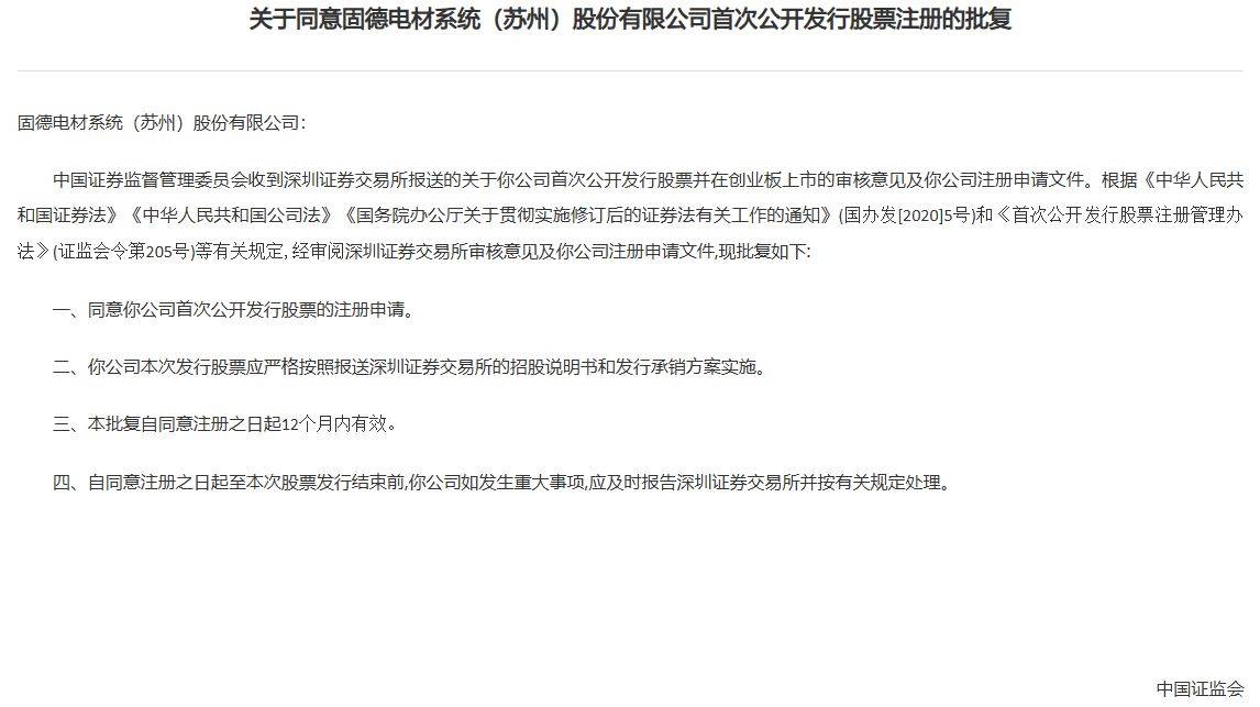 PG电子(Pocket Games Soft )全球首屈一指的电子游戏供货商[永久网址:363050.com],首位跨足线下线上电子游戏开发。PG电子,pg娱乐,PG电子试玩平台,PG电子技巧,PG电子下载,欢迎注册体验!小财米注意到,2026年1月08日,证监会网站披露,同意创业板企业固德电材系统(苏州)股份有限公司的首次公开发行股票注册的批复。