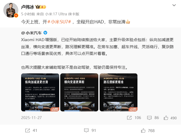 面对传闻,卢伟冰未选择正式声明,1月12日,他以“转发小米汽车动态并配文‘今天上班’”这种更贴近公众的方式回应,迅速打破离职猜测。